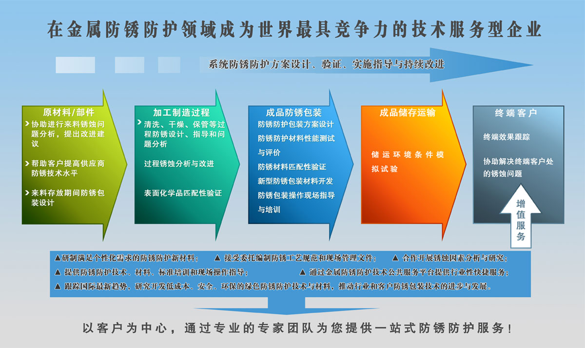 通過一站式、標(biāo)準(zhǔn)化、差異化、增值化的服務(wù)來降低客戶的心理成本和使用成本,最終提高客戶的收益,使沈陽防銹服務(wù)“超越客戶期望,超越行業(yè)標(biāo)準(zhǔn)”,成為防銹業(yè)服務(wù)的旗艦品牌。