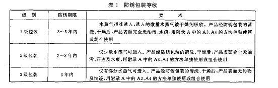 ①包裝的防銹等級(jí)應(yīng)根據(jù)產(chǎn)品的抗銹蝕能力、流通環(huán)境、包裝容器的結(jié)構(gòu)、包裝材料的一般性能等因素來確定,防銹包裝等級(jí)分為:1級(jí)包裝、2級(jí)包裝、3級(jí)包裝.詳見表1,